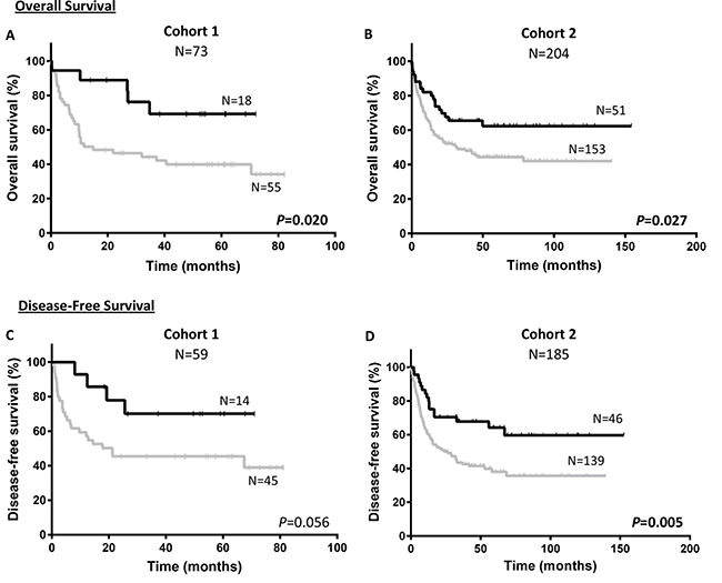 The main characteristics of the patients from the two cohorts are shown in Table 1. In summary, the Cohort 1 had 73 patients, while the Cohort 2 had 206 patients. The median ages were 52 and 53 years with a 47% and a 43% of patients younger than 50 years, respectively. Most of the characteristics, including age, gender, NPM1 and FLT3/NPM1 combined mutations did not show significant differences between the two cohorts. However, in Cohort 1, the median of white blood cells (WBC) count, the percentage of patients with the WBC count over 20 × 109/L, FLT3/ITD+ and CEBPA- were significantly higher than in Cohort 2. The percentage of patients in some subgroups of the French-American-British (FAB) classification was also significantly different between cohorts.