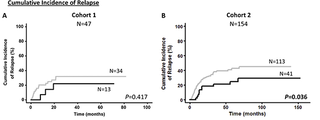 Overall survival (OS), disease-free survival (DFS) and cumulative incidence of relapse (CIR) were assessed in the statistical analysis. OS was calculated from the time of patient diagnosis to death or last date of follow-up (dead vs alive patients) and DFS from the complete remission date to relapse/death or last date of follow-up (dead or relapsed vs alive patients). Finally, CIR was calculated from the complete remission date to relapse or last date of follow-up or death (competing risk analysis: relapsed vs alive non-relapsed vs dead non-relapsed patients).