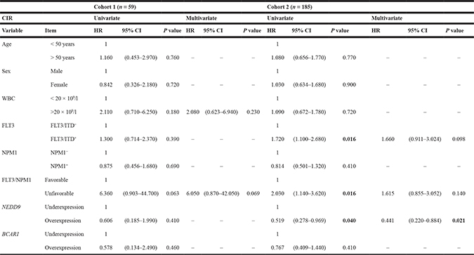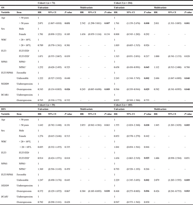 Statistical analyses were performed in the IBM SPSS Statistics (Release 22.0.0.0, New York, NY, USA). The differences between clinical data of the two cohorts and the association between the NEDD9 expression and clinical data were analyzed using the Fischer exact test or χ2 test. Differences between continuous variables were analyzed with the Student’s t-test or the Mann-Whitney U test in those showing normal or abnormal distribution, respectively. Exploratory univariate analyses were performed to choose the threshold value to dichotomize the NEDD9 and BCAR1 mRNA levels in over and underexpression. After analyzing the mean, the median and different percentiles the best results were obtained with the third quartile (75th percentile) that is the cutoff selected to perform this study. Independent variables analyzed included age, gender, white blood cell count (WBC) at diagnosis, FAB category, and molecular alterations (FLT3/ITD, NPM1, and CEBPA). Time-dependent endpoints such as OS, DFS and CIR were assessed, and the endpoint for the threshold was death and relapse. Time-dependent outcomes were calculated using Kaplan–Meier curves (OS or DFS), and the log-rank test was used for comparisons [39]. The regression model used in univariate and multivariate analyses was COX test (OS and DFS). The free statistical package R Studio (Version 0.98-1102, 2009–2014, RStudio Inc., Boston, MA, USA) through the R version 3.1.2 (2014-10-31, The R Foundation for Statistical Computing) [40] was used for the competing risk analysis. CIR was analyzed by Gray [41] and Fine and Gray’s tests [42], using R Studio and the cuminc and crr functions through the cmprsk package. After exploratory univariate comparisons, multivariate analyses were performed including variables with a p-value below 0.25 and the INTRO method was used in SPSS to analyze Cox regression. Hazard ratios (HR) with relative 95% confidence interval (CI) are shown in both univariate and multivariate analyses. Any differences were considered to be statistically significant when the p-value was < 0.05.