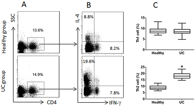 Figure 1: Peripheral CD4+ T cells in UC patients and healthy subjects. Blood samples were collected from 20 UC patients and 20 healthy subjects. PBMC were isolated from the blood samples and analyzed by flow cytometry. (A) CD4+ T cells were gated. (B) the IL-4+ T cells and IFN-γ+ T cells were gated from the gated CD4+ T cells in panel A. (C) the floating bars indicate the summarized data [mean ± SD; *p<0.01 (t test), compared with the healthy group] of Th1 and Th2 cells in panel B. Samples from individual subjects were analyzed separately. Each experiment was repeated 3 times.
