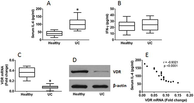 Figure 2: Serum IL-4 is negatively correlated with expression of VDR in CD4+ T cells. The blood samples and PBMC were the same as that in Figure 1. (A-B) the results of ELISA show the levels of serum IL-4 (A) and IFN-γ (B). (C-D) the RT-qPCR (C) and Western blotting (D) results show VDR expression in peripheral CD4+ T cells. (E) the correlationship between the serum IL-4 and VDR mRNA in the CD4+ T cells of UC patients. The data of bars are mean ± SD. *p<0.01 (t test), compared with the healthy group. Samples from individual subjects were analyzed separately.