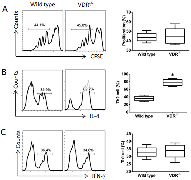 Figure 3: VDR-/- CD4+ T cells are prone to differentiating into Th2 cells. (A) CFSE-dilution assay results, of which naive CD4+ T cells were labeled with CFSE and cultured for 3 days in the presence of the activating reagents, including antibodies of CD3 (coated the culturing wells) and CD28 (5 μg/ml), PMA (10 ng/ml) and ionomycin (100 ng/ml). (B-C) the flow cytometry histograms show the frequency of Th2 cells (B) and Th1 cells (C) after the naive CD4+ T cells were cultured for 6 days in the presence of the activating reagents. Brefeldin A (10 μg/ml) was added to the culture in the last 3 h. The floating bar graphs show the summarized flow cytometry histogram data on the left side. The data of bars are presented as mean ± SD; *p<0.01 (t test), compared with the wild type mice. The data are summarized from 3 independent experiments.