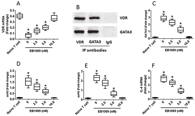 Figure 4: VDR agonists down regulate IL-4 gene transcription in Th2 cells. Th2 cells were generated from mouse spleen cells and cultured for 3 days in the presence of EB1089 (a VDR agonist) at the indicated concentrations as denoted on the X axis. (A) the VDR mRNA levels. (B) the complex of VDR and GATA3. (C-E) the levels of GATA3, acH3 and acH4 at the IL-4 promoter locus. (F) the levels of IL-14 mRNA. The data of bars are presented as mean ± SD. *p<0.01 (t test), compared with the naive T cells. The data represent 3 independent experiments.