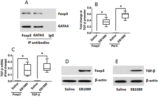 Figure 5: VDR agonists convert Th2 cells to Tregs. Th2 cells were generated from mouse spleen cells. (A) IP results show a complex of GATA3 and Foxp3 was detected in the Th2 cells. (B-E) the Th2 cells were cultured for 6 days in the presence of EB1089 (10 nM) and T cell activators. (B) ChIP results show the binding of Foxp3 to and the Pol II levels at the TGF-β promoter locus. (C) RT-qPCR results show the levels of Foxp3 and TGF-β in the T cells. (D-E) Western blotting results show the protein levels of Foxp3 and TGF-β in the T cells. The data of bars are presented as mean ± SD. *p<0.01, compared with the saline group. The data represent 3 independent experiments.