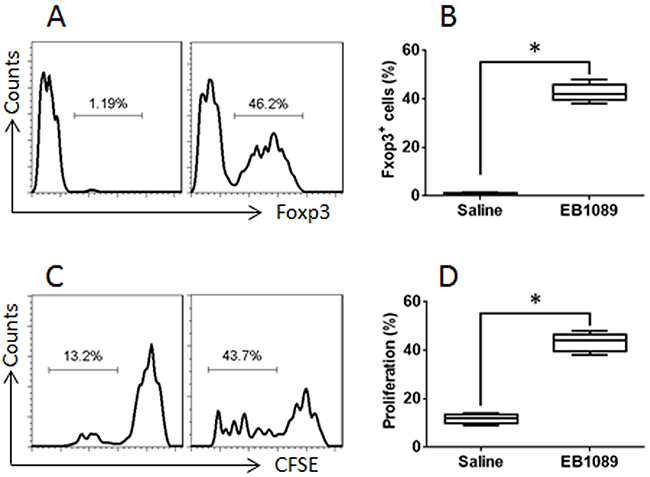 Figure 6: VDR agonists convert UC patients’ CD4+ T cells to Tregs. Blood samples were collected from 6 UC patients. The CD4+ CD25+ CD127+ T cells were isolated from the PBMC by MACS and cultured with EB1089 (10 nM) for 6 days. (A) flow cytometry results show the frequency of Foxp3+ cells converted by EB1089. (B) the summarized data of panel A. (C) the CD4+ CD25+ CD127- Tregs were isolated from the T cells of panel A by MACS. Effector T cells (Teff; CD4+ CD25-, labeled with CFSE) were isolated from healthy subjects by MACS. The flow cytometry results show the proliferation of the Teff cells. (D) the summarized data of panel C. The data of bars are presented as mean ± SD. *p<0.01, compared with the saline group. The data represent 3 independent experiments.