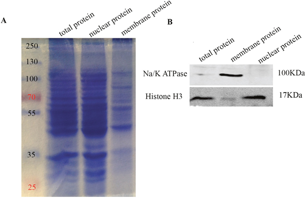 Figure 1: Western blot analysis of membrane proteins purification. (A) Coomassie Brilliant Blue stained SDS-PAGE gel showing molecular weight marker (lane1), total C6 cellular protein (lane2), nuclear protein fraction (lane3) and purified membrane protein fraction (lane4). 30 μg protein was loaded in lanes 2-4. As shown, membrane fraction has fewer number of proteins compared to the nuclear fraction and total cellular protein. Molecular weight marker shows 250, 130, 100, 70, 55, 35, and 25kDa bands. (B) Western-blot analysis shows Na+/K+ ATPase (100 kDa membrane protein) and histone H3 (17 kDa nuclear protein) in total C6 cellular protein (lane1), nuclear protein fraction (lane2) and purified membrane protein fraction (lane3). As shown, Na+/K+ ATPase is enriched in the membrane fraction, whereas histone H3 is enriched in the nuclear fraction.