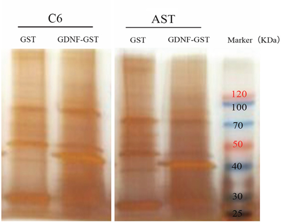C6: C6 rat glioma cells; AST: primary rat astrocytes; GDNF-GST: fusion of GDNF and GST proteins; GST: GST protein alone.