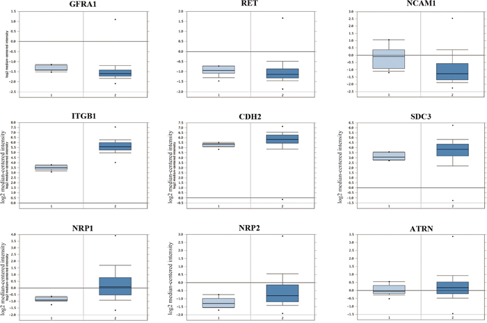 Analysis of human GBM and normal brain data from TCGA datasets revealed that mRNA levels of GFRA1, RET, NCAM1, CDH2, SDC3 and ATRN were comparable (p>0.05), whereas mRNA levels of Integrin beta-1 (ITGB1), NRP1 and NRP2 were elevated in the GBM brains (P<0.01, FC>1.5; Figure 3).
