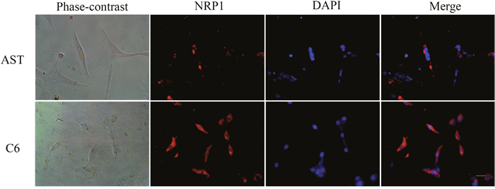 Figure 4: Immunofluorescence staining of NRP1 in C6 rat glioma cells and primary rat astrocytes. Representative immunofluorescence staining images of C6 rat glioma cells (C6) and rat primary astrocytes (AST). (Left to right) Phase contrast, NRP1 staining (probed with anti-NRP1 antibody; red), nuclear staining (DAPI; blue) and Merged (NRP1 and DAPI) images are shown for AST (top) and C6 (bottom) cells. NRP1 expression was significantly higher in C6 cells than AST (P<0.05). Note: scale bar = 40 μm.