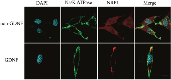 Figure 5: Immunofluorescence analysis showing membrane recruitment of NRP1 by exogenous GDNF in C6 glioma cells. Representative laser confocal immunofluorescence images of C6 rat glioma cells stained with (left to right) DAPI (blue, nuclear staining), anti-Na+/K+ ATPase antibody (green, membrane staining), anti-NRP1 antibody (red) and merge (DAPI, anti-Na+/K+ ATPase and anti-NRP1) in GDNF treated (bottom) and non-GDNF treated (top) cells. NRP1 was recruited to the cell membrane after short-term GDNF treatment, whereas NRP1 was localized in the cytoplasm in the non-GDNF group. Note: scale bar = 20 μm.