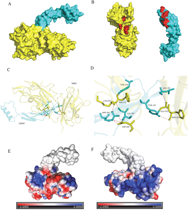 Figure 6: Illustration of binding interactions between GDNF and NRP1. Interaction between GDNF and NRP1 based on protein structure docking performed by the ZDOCK server and visualized by PyMOL Molecular Graphics System. (A) A surface presentation of the GDNF-NRP1 binding interface. Blue: GDNF; yellow: NRP1. (B) Surface images of GDNF (Blue) and NRP1 (yellow) showing H-bond between amino acid residues of GDNF and NRP1 (red). (C) A ribbon and stick presentation of GDNF-NRP1 binding. Blue: GDNF; yellow: NRP1. (D) A stick presentation of the GDNF-NRP1 binding interface showing the 8 H-bonds between the corresponding amino acids. (E) Surface presentation showing electrostatic interaction between NRP1 and GDNF on one side. Red denotes negative charge whereas blue denotes positive charge. (F) Surface presentation showing electrostatic interaction between NRP1 and GDNF on the opposite side to that shown in E.
