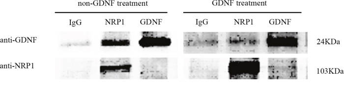After blocking by 5% skimmed milk, the samples were incubated with primary antibody (rabbit anti-NRP1, ab81321, Abcam, 1:250; mouse anti-alpha 1 Na/K-ATPase, ab7671, Abcam, 1:250; rabbit anti-GDNF, ab18956, Abcam, 1:100; mouse anti-β-actin, sc47778, Santa cruz, 1:1000; rabbit anti-Histone H3 antibody, BS1660, bioworld, 1:500) at 4°C overnight [57]. Then, the samples were incubated with IRdye secondary antibodies (goat anti-Rabbit, LI-COR, Odyssey, 1:1000; goat anti-Mouse, LI-COR, Odyssey, 1:1000) at room temperature for 2h. Finally, the protein bands were scanned by Odyssey imaging system (LI-COR, USA) and quantified with ImageJ software (National Institutes of Health, USA).