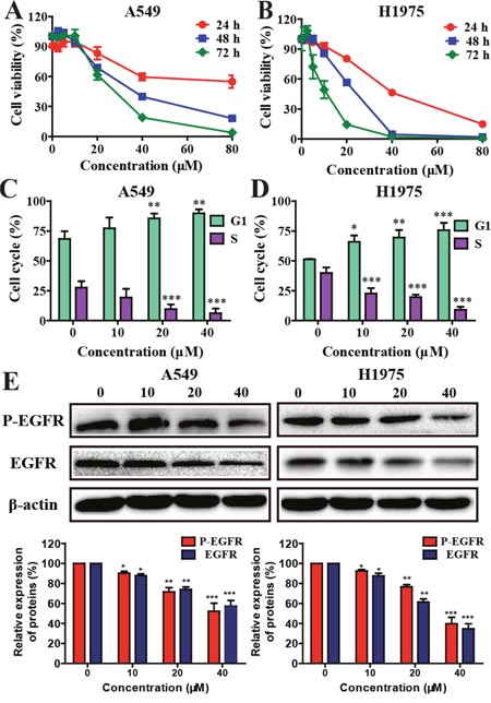Figure 1: Effects of metapristone on non-small cell lung cancer cell viability. (A and B) Cells were incubated with different concentration of metapristone for 24, 48 or 72 h. Flow cytometry analyzed the cell cycle distribution in A549 (C) and H1975 (D) cells. (E) Western blotting (upper) and related quantitative analysis (lower) showed the changes of P-EGFR and EGFR in A549/H1975 cells induced by metapristone treatment. Date were the mean ± SEM (n=3). * P<0.05, ** P<0.01 and *** P<0.001, compared with the control.