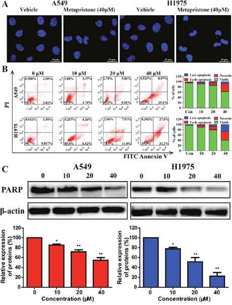 Figure 2: Effects of metapristone on non-small lung cancer apoptosis in A549 and H1975 cells. (A) A549 and H1975 cell morphological changes and nuclear alterations after metapristone treatment. The condensed and fragmented fluorescent nuclei of apoptotic cells are visible in the treated cells, but not in the control cells. (B) Flow cytometric analyzed cell apoptosis in A549 and H1975 cells using the Annexin V-FITC/PI dual-labeling technique. Quantified values were shown on the right. (C) The levels of the typical apoptosis-related proteins total PARP were determined by Western blotting (upper). The expression of total PARP was quantified by using Image Lab analysis software. The condensed and fragmented fluorescent nuclel (white arrows) of apoptotic cells are visible in the treated cells, but not in the control cells. Date were the mean ± SEM (n=3). * P<0.05, ** P<0.01 and *** P<0.001, compared with the control.