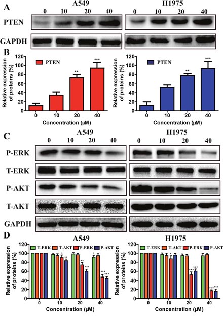 Figure 4: Effects of metapristone treatment on PTEN/AKT, and ERKs signal pathway in NSCLC cells. (A) A549 and H1975 cells treated with 10-40 μM metapristone for 24 h was to determine its effect on the expression PTEN proteins. (B) Related quantitative analysis showed changes PTEN in A549 and H1975 cells induced by metapristone treatment. (C and D) Western blotting (C) and related quantitative (D) analysis showed changes in expression of P-AKT, T-AKT, P-ERK and T-ERK in A549 cells, and of P-AKT, T-AKT, P-ERK and T-ERK in H1975 cells induced by metapristone. The date expressed as the mean ± SEM (n=3). * P<0.05, ** P<0.01 and *** P<0.001, compared with the control.