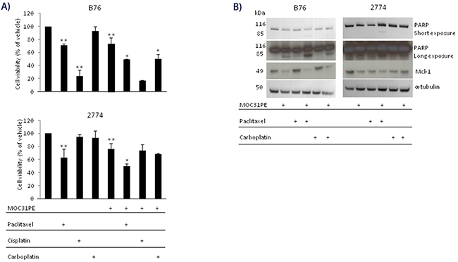 Figure 1: MOC31PE in combination with paclitaxel causes additive cytotoxicity in vitro. (A) B76 and 2774 cells were incubated with paclitaxel (50 nM) and/or carboplatin (100 µM) and/or cisplatin (33 µM) and/or MOC31PE (10 ng/ml) for 24 h. Cell viability is expressed as a percentage (mean {plus minus} SD) of the value obtained in vehicle treated cells. The assays were performed in triplicate, and repeated at least three times. **; p<0.05 compared to vehicle treated cells, *; p<0.05 compared to monotherapies. (B) Western immunoblots of cell lysates from B76 and 2774 cells treated for 24 h with MOC31PE (10 ng/ml) and/or paclitaxel (50 nM) and/or carboplatin (100 µM). The 116- and 85-kDa bands represent the uncleaved and cleaved versions of PARP, respectively.