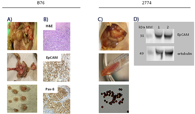 Figure 2: Characterization of peritoneal metastasis models of human epithelial ovarian carcinoma. (A) Photographs taken at autopsy of a representative mouse on day 24 after i.p. injection of 2.5x106 B76 cells. A mean number of 54 (SD 17) tumor nodules were seen distributed all over the peritoneal surfaces, including ovaries, kidneys, bladder, intestine and spleen. (B) Representative images of B76 tumor sections after hamatoxylin-eosin (H&E) and immunohistochemical staining. H&E stained B76 tumor section (top), strong EpCAM expression in the plasma membrane (middle), and both cytoplasmic and nuclear Pax8 staining (lower) picture. Magnification x40. (C) Photographs taken at autopsy of a mouse on day 23 after i.p. injection of 2.5x106 2774 cells. A mean number of 25 (SD 12) tumor nodules with a distribution similar to that seen with B76 cells. EpCAM-positive cancer cells in the ascites fluid were detected and isolated with immunomagnetic MOC31-coated beads (two lower pictures). (D) Immunoblots showing EpCAM expression (lane 1 and 2) in isolated 2774 cells from ascites of two representative animals with anti-α-tubulin antibody as loading control.