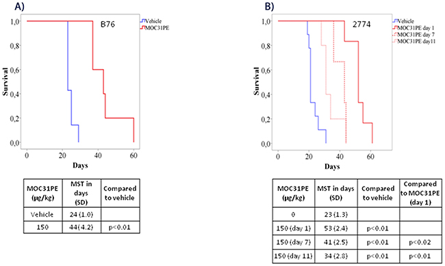 Figure 3: MOC31PE increases survival of mice with B76 and 2774 peritoneal metastases. Kaplan-Meier survival curves of mice injected i.p. with (A) B76 and (B) 2774 cells. B76 animals were treated i.p. 24 h later with one dose of MOC31PE (150 µg/kg) or vehicle whereas 2774 mice received a single treatment dose either day 1, day 7 or day 11 after injection of the tumor cells. The mean survival time (MST) is summarized in the tables under the graphs.