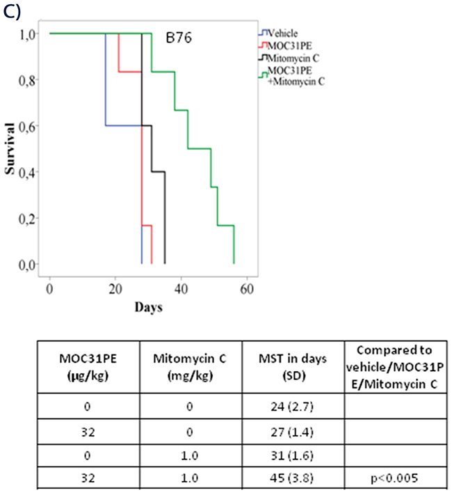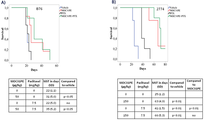 Figure 4: In vivo efficacy of MOC31PE, paclitaxel and mitomycin C as single agents and in combination experiments. Kaplan-Meier survival curves of groups of at least five mice injected with B76 (A) or 2774 (B) cells and treated i.p. 24 h later with single doses of MOC31PE and paclitaxel (7.5 mg/kg) alone and in combination, with vehicle as control. The MOC31PE dose was low in B76 mice (50 µg/kg) and high in 2774 mice (150 µg/kg). The mean survival times (MST) and p-values are summarized in the tables under the graphs. (C) Kaplan-Meier survival curves of groups of at least five mice inoculated with B76 cells and treated i.p. 24 h later with single doses of a low MOC31PE (32 µg/kg) and a low mitomycin C (1mg/kg) or the combination, and with vehicle as a control. The MST summary for the different groups is shown in the table under the graph. The significance between treatment and vehicle animals were determined by the log-rank test.