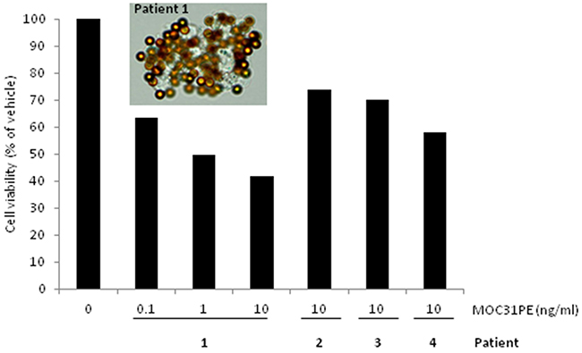 Figure 5: Ex vivo effects of MOC31PE on ovarian cancer cells freshly isolated from patients’ peritoneal metastases. The picture shows EpCAM-positive cells isolated from disaggregated tumor tissue from patient 1 using immunomagnetic MOC31-coated beads. Cells from patient 1 were treated with MOC31PE (0.1-10 ng/ml) or vehicle and incubated at 37°C for 24 h, demonstrating a dose-response relationship with less than 40% cell viability at 10 ng/ml. Disaggregated tumor tissue from patient number 2, 3 and 4 was treated with MOC31PE (10 ng/ml), with cell viability of 60 and 75% compared to vehicle (p<0.05). The assays were performed in at least six parallels