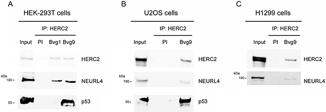 Figure 1: Interaction network between NEURL4, HERC2, and p53 proteins. (A) Supernatants (input) of lysates from HEK-293T cells were immunoprecipitated (IP) using two different antibodies against HERC2 (Bvg1 and Bvg9) and analyzed by immunoblotting with antibodies against the indicated proteins. Preimmune serum (PI) was used as negative control. Similar experiments were performed in U2OS cells (B) and H1299 cells (C).