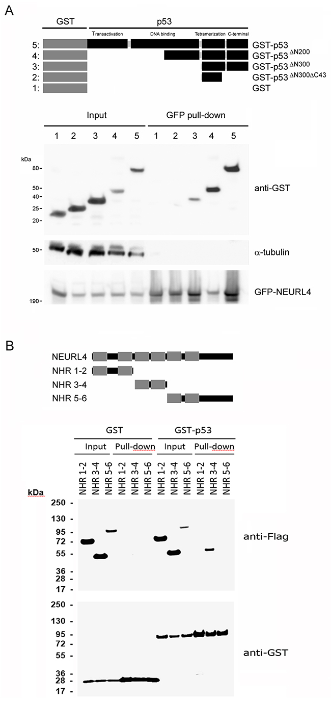 Figure 3: Interaction domains between p53 and NEURL4. (A) H1299 cells were transfected with GFP-NEURL4 and the indicated GST-p53 constructs expressing different regions of p53 fused to GST. Domains of p53 are indicated. GST construct was used as negative control. 48 h later, cells were lysed and centrifuged. Supernatants (Input) were incubated with GFP-Trap. Proteins retained on the resin were analyzed by immunoblotting with antibodies against the indicated proteins. α-tubulin was analyzed as control of unspecific binding. (B) H1299 cells were transfected with GST or GST-p53 and the indicated constructs expressing different regions of NEURL4. Neuralized domains (NHR) of NEURL4 are indicated. 48 h later, cells were lysed and centrifuged. Supernatants were incubated with Glutathione-Sepharose. Proteins retained on the resin were analyzed by immunoblotting with antibodies against the indicated proteins.