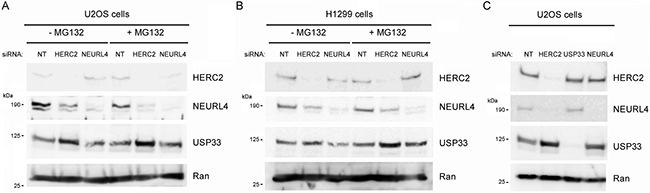 Figure 4: Ubiquitin ligase activity of HERC2 and NEURL4 stability. U2OS cells (A and C) or H1299 cells (B) were transfected with non-targeting (NT), HERC2, NEURL4 or USP33 siRNAs. 72 h later, lysates were analyzed by immunoblotting with antibodies against the indicated proteins. Before lysis, cells were treated with the proteasome inhibitor MG132 for 6 h. Ran protein was analyzed as loading control.
