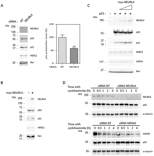 Figure 5: NEURL4 regulates the levels of p21 protein. (A and D) U2OS cells were transfected with non-targeting (NT), NEURL4 or MDM2 siRNAs. 72 h later, lysates were analyzed by immunoblotting with antibodies against the indicated proteins. Levels of p21 protein were quantified and normalized with respect to Ran levels. When it is indicated, cells were treated with cycloheximide (20 μg/ml) for the indicated times. (B) U2OS cells were transfected with pcDNA3 (-) or myc-NEURL4 (+) plasmids. (C) H1299 cells were transfected with 0.5 μg of p53 construct and increasing amounts (0.5, 1 and 2 μg) of myc-NEURL4 constructs. 48 h later, lysates from transfected cells were analyzed by immunoblotting with antibodies against the indicated proteins. Ran protein was analyzed as loading control. Data are expressed as mean ± S.E.M. Statistical analysis was carried out as described under “Materials and Methods”. The differences are shown with respect to NT siRNA. **, p< 0.01.