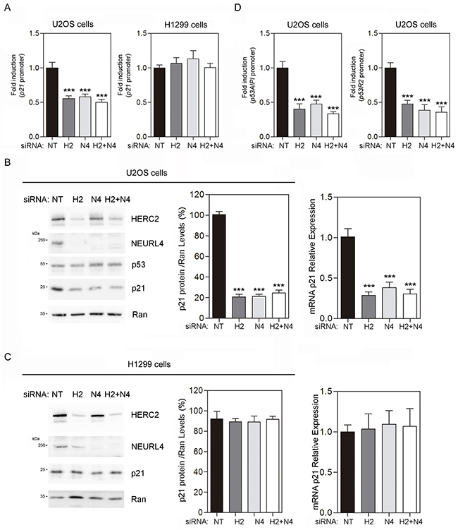 Figure 6: NEURL4 regulates the transcriptional activity of p53. (A and D) U2OS cells or H1299 cells were transfected with non-targeting (NT), NEURL4 (N4) or HERC2 (H2) siRNAs and the luciferase reporter indicated (p21, p53AIPI or p53R2 promoter). 72 h later, the luciferase activity was quantified as indicated under “Materials and Methods”. (B) U2OS cells or (C) H1299 cells were transfected with non-targeting (NT), NEURL4 (N4) or HERC2 (H2) siRNAs. RT quantitative PCR (RT-qPCR) analysis was performed to analyse gene expression of p21. The levels of p21 expression were quantified and normalized with respect to GAPDH gene expression (right panels in B and C). Lysates from these cells were also analyzed by immunoblotting with antibodies against the indicated proteins (left panels in B and C). Levels of p21 protein were quantified and normalized with respect to Ran levels (central panels in B and C). Data are expressed as mean ± S.E.M. Statistical analysis was carried out as described under “Materials and Methods”. The differences are shown with respect to NT siRNA. **, p< 0.01; ***, p< 0.001.