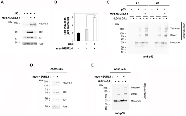 Figure 7: NEURL4 regulates p53 oligomerization. H1299 (A-C) and A549 (D and E) cells were transfected with pcDNA3 (negative control: -) and the indicated plasmids. (A and D) 24 h later, lysates were analyzed by immunoblotting with antibodies against the indicated proteins. Ran protein was analyzed as loading control. (B) Under the same conditions, luciferase activity of p21 promoter was analyzed as indicated under “Materials and Methods”. (C and E) Lysates from cells transfected with the indicated plasmids were incubated with glutaraldehyde (GA) at 0.04% on ice for 30 min, and p53 oligomerization was analyzed by immunoblotting with anti-p53 antibody as indicated under “Materials and Methods”. Data are expressed as mean ± S.E.M. Statistical analysis was carried out as described under “Materials and Methods”. *, p< 0.05; ***, p< 0.001.