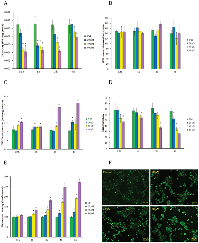 Figure 2: Intracellular GR activity reduction, thiol oxidative stress generation and protein S-glutathionylation induced by 2-AAPA. (A) GR activity in the control and 2-AAPA-treated TE-13 cells. The data are presented as unit/mg protein. (B, C & D) Evaluation of intracellular GSH, GSSG, and GSH/GSSG ratio in the control and 2-AAPA-treated TE-13 cells. (E) ROS production in the control and 2-AAPA-treated TE-13 cells. The data are presented as fluorescence intensity. (F) 2-AAPA increased protein S-glutathionylation in TE-13 cells. The cells were treated with the indicated concentrations of 2-AAPA for 1 h, followed by fixation, and fluorescent staining as described in Materials and Methods. The data are derived from one of the three independent experiments. Cells were viewed under a fluorescent microscope. *, P < 0.05 compared with control group. All the data are expressed as the mean ± SD of three independent experiments.