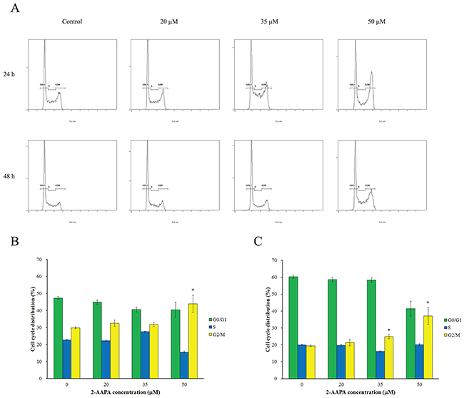 In order to understand the cell growth inhibition induced by 2-AAPA, the cell cycle distribution in TE-13 cells was investigated by flow cytometry. As shown in Figure 3, 2-AAPA at 20 μM produced small changes in DNA content between all phases of cell cycle. Whereas, 50 μM of 2-AAPA at 24 h-treatment resulted in significantly (P < 0.05) G2/M phase cell cycle arrest compared to the control. In 48 h treatment, 2-AAPA at 35 μM and 50 μM concentrations both induced significant cell cycle arrest in G2/M phase. The increase in cell population in G2/M phase was associated with a corresponding decrease in the population of cells mainly in G0/G1 phase.