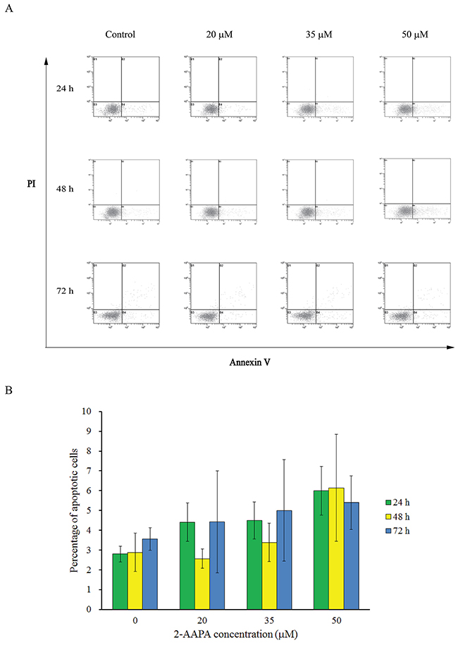 Figure 4: Effect of 2-AAPA on the induction of apoptosis in TE-13 cells. TE-13 cells were treated with different concentrations of 2-AAPA for 24 h, 48 h and 72 h and then stained with Annexin V and PI. (A) Apoptotic assays were performed by flow cytometry. (B) The percentages of apoptotic cells are presented for 24 h, 48 h and 72 h treatments. Results are presented as the mean ± SD of three independent experiments.