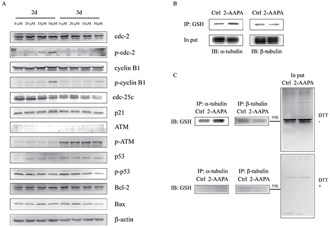 Figure 5: Identification of proteins potentially regulated by 2-AAPA in TE-13 cells. (A) Assessment of the possible signaling pathways involved in G2/M phase cell cycle arrest and apoptosis. TE-13 cells were treated with 2-AAPA at the indicated concentrations for 48 h and 72 h, followed by the Western blot analysis for detection of Cdc-2, Cdc-25c, p-Cdc-2, Cyclin B1, p-Cyclin B1, p21, ATM, p-ATM, p53, p-p53, Bcl-2 and Bax expressions. β-actin was used as a loading control. The data are derived from one of the three independent experiments. (B and C) TE-13 cells were treated the same as in (A). Protein S-glutathionyaltion on α/β-tubulin was examined by reciprocal immunmoprecipitation and western blotting analysis as indicated.