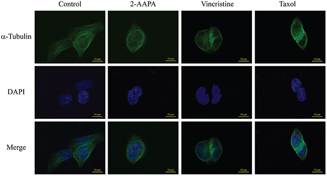Figure 6: 2-AAPA induces microtubule depolymerization in TE-13 cells. TE-13 cells were treated with the indicated concentrations of 2-AAPA for 5 h, followed by fixation, permeabilization and indirect immunofluorescent analysis with an anti-α-tubulin-FITC. Nuclei were stained with DAPI. Taxol and vincristine sulfate were employed as positive controls for microtubule stabilization and microtubule depolymerization, respectively. Fluorescent images were captured by an Olympus Fluoview FV1200 microscope. The data are derived from one of the three independent experiments.