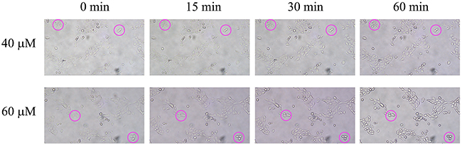 Cultured TE-13 cells were treated with 40 and 60 μM 2-AAPA. Live cell images were taken by an Olympus CKX53 microscope with designed time intervals.