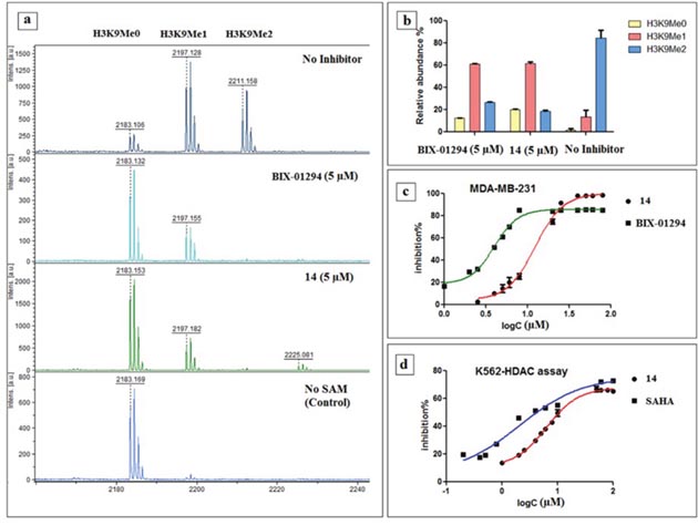 Figure 6: Results of biological assays. (a) Methylation pattern observed via MALDI-TOF after incubating with inhibitor 14 and BIX-01294 for 30 min, (b) % ratio of the H3K9Me0, H3K9Me1 and H3K9Me2 after incubating 30 min with 14 and BIX-01294 versus no inhibitor, (c) In-Cell Western (ICW) assay of 14 and BIX-01294 in MDA-MB 231 cell lines, (d) Result of homogenous histone deacetylase assay of 14 alongside SAHA in K562 cell lines.