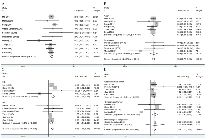 Figure 2: Forest plots of cancer risk associated with LMP2-60 G>A (rs17587) polymorphism under homozygote model. (A) Overall result; (B) subgroup analysis by ethnicity; (C) stratified analysis by design of study; (D) subgroup analysis by cancer types.