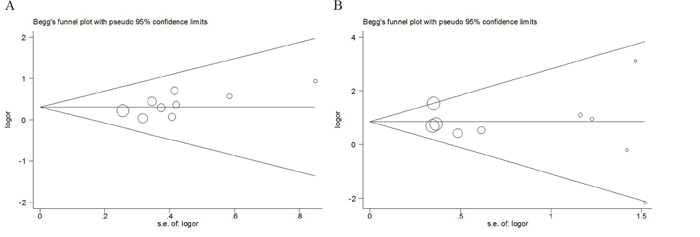 Figure 5: Begg’s funnel plot for publication bias test of LMP polymorphisms: rs17587 (A), rs2071543 (B), under homozygous model.