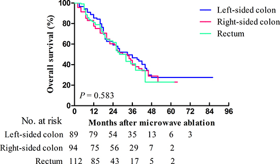 The liver represents the most common site of distant metastases in patients with CRC. Approximately 25.0% of patients present with synchronous liver metastases (LMs) at initial diagnosis and another 50.0% will develop LMs during their disease course [11]. Although surgical resection is the gold standard of treatment for colorectal LMs (CRLMs), only 8.0%–27.0% of patients are suitable candidates for hepatectomy [12]. For unresectable CRLMs, thermal ablation has been developed to serve as an alternative for local curative intent [13]. Of the different ablative treatment modalities, microwave ablation (MWA) has gained particular interest due to its non-reliance on electrical conductivity, char resistance, reduced heat-sink effect, and simultaneous administration of multiple antennas [14]. The safety and efficacy of MWA for liver malignancies have been confirmed in our previous studies [15, 16]. For CRLMs, the reported 4-year overall survival (OS) rate ranges from 35.2%–41.0% after MWA [11, 17–19]. To the best of our knowledge, the prognosis of patients with CRLMs after MWA according to primary tumor location remains poorly understood. Therefore, we aimed to investigate the prognosis of patients with CRLMs after MWA according to primary tumor location.