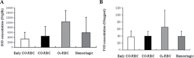 Oxidative damage is caused by a large number of oxygen free radicals which are generated with the recovery of oxygen supply after resuscitation from hemorrhagic shock, including lipid peroxidation of cell membrane, denaturation of proteins and nucleic acids [14]. Previous studies revealed that antioxidases had high affinity and reaction rate with oxygen free radicals [15]. In the current study, two antioxidases SOD and POD were selected as indicators to evaluate the oxidative damages reduced by resuscitation. The results showed that the activities of SOD and POD were both higher in O2-RBC resuscitation group. And the activity of SOD was lower in early CO-RBC and CO-RBC resuscitation groups. All of the data suggested that COHb could suppress the generation of oxygen free radicals through delaying the recovery of oxygen supply, thus reducing the oxidative injury. However, the specific damage should be assessed by further detection of malonaldehyde (MDA) level in tissues, which was also one of the limitations in the study.
