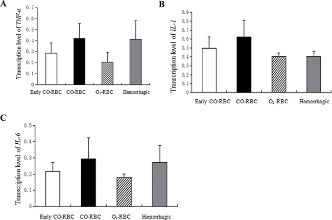 The increased expression of TNF-α, IL-1β, and IL-6 at mRNA level with COHb intervention