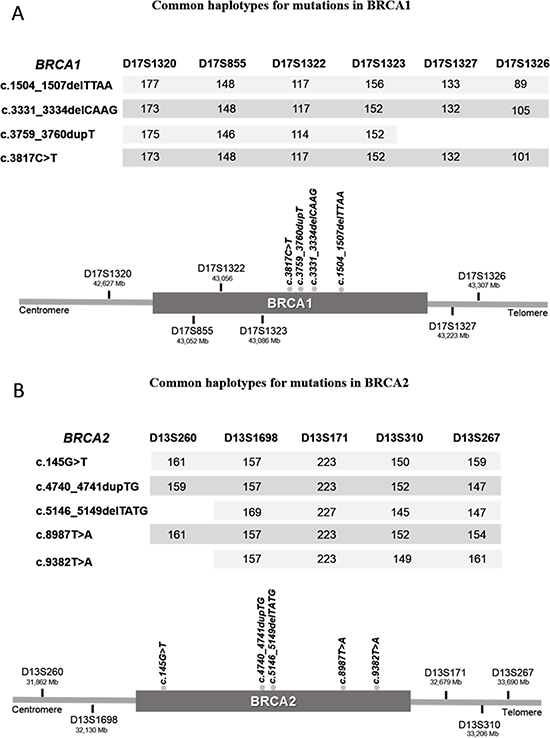 We analyzed a total of 11 Short Tandem Repeats (STR) markers. For mutations in BRCA1: D17S1323, D17S1322, D17S855, D17S1320, D17S1326 and D17S1327, covering 0.68 Mb, and for mutations in BRCA2: D13S260, D13S1698, D13S267, D13S171 and D13S310 covering 1.82 Mb. All loci were amplified by PCR using primers, end-labeled with different fluorophores (VIC, 6-FAM, PET and NED). PCR products were analyzed by capillary electrophoresis in an ABI PRISM 3130x fragment analyzer (Applied Technologies) using Peak Scanner Software 2 to confirm product amplification and size. The STR alleles associated to each recurrent mutation were grouped in haplotypes for all samples carrying the same mutation, and phases were confirmed by PHASE v2.1 [47, 48] (stephenslab.ucicago.edu/phase). A minimum common haplotype was determined to define a common ancestor.