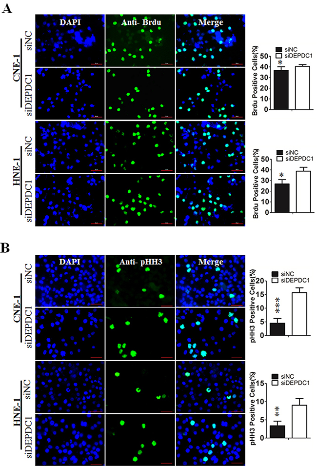 Figure 4: DEPDC1 depletion causes mitotic cell cycle arrest. (A) CNE-1 and HNE-1 cells were seeded and transfected with negative control siRNA or DEPDC1 siRNA. Forty-eight hours after transfection, DNA biosythensis was labelled by BrdU (green). DAPI was used to stain cell nuclei (blue). BrdU positive cells were counted and subjected to statistical analysis (P* < 0.05, Student’s t-test). Scale bar 50μm. (B) CNE-1 and HNE-1 cells were transiently transfected with siRNA as in Figure 4A. Forty-eight hours after transfection, cells were fixed and stained with anti-phospho-histone H3 antibody (green). The pHH3 positive cells were counted and subjected to statistical analysis (P** < 0.01, Student’s t-test).