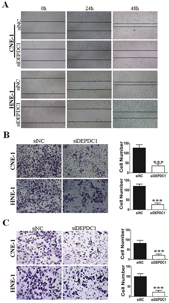 Figure 7: DEPDC1 depletion inhibits migration and invasion in NPC cells. CNE-1 and HNE-1 cells were transiently transfected with control and DEPDC1 siRNA. Twenty-four hours after transfection, cells were subjected to would healing assay (A), transwell migration (B) and transwell invasion (C) assay, respectively. Representative images were shown and the migrated and invaded cells were quantified and subjected to statistical analysis ( P*** < 0.001, Student’s t-test).