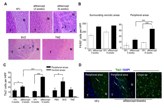 Figure 1: Accumulation of tumor-infiltrating microglia/macrophages and Tie2+ cells at the tumor edge of intracranial U-87 MG glioma-bearing mice after anti-VEGF treatment. (A) Anti-angiogenic treatment induced invasive tumor outgrowth in the malignant glioma model. Tumor sections from mice treated, as indicated in Methods section, with hFc (control), aflibercept (for 3 weeks or 6 weeks), bevacizumab (BVZ), or TMZ were stained with Harris hematoxylin and eosin. Arrows point to tumor nodules and satellitosis in sections from tumor-bearing mice that received aflibercept for 6 weeks or bevacizumab. No invasive glioma features (N, normal brain; T, tumor; t, tumor nodule) were observed in animals treated with hFc, aflibercept for 3 weeks, or TMZ. Magnification: upper row (20x), lower row (10x). (B) Quantification of F4/80+ cells in surrounding necrotic tumor areas and in peripheral tumor/normal brain edges in mice treated with hFc or aflibercept as indicated. F4/80+ cells were counted with a high-power field (HPF) (200x). Data are presented as mean ± SD (n = 4-5 animals per group). *** P < 0.001. (C) Quantification of Tie2+ cells at glioma tumor edge and at the tumor center from mice treated with hFc for 3 weeks or 6 weeks, aflibercept for 3 weeks or 6 weeks, phosphate-buffered saline (PBS; a control), bevacizumab, or TMZ. Tie2+ cells were counted with a high-power field (HPF) (200x). Data are presented as mean ± SD (n = 4-5 animals per group). * P < 0.05; *** P < 0.001. (D) Representative images of Tie2 staining of sections from mice treated with hFc or aflibercept (6 weeks). Pictures show merged fluorescent Tie2 (green) and DAPI (blue). Arrows indicate Tie2+ cells. N, normal tissue; T, tumor. Magnification: 200x; closeup, 400x.