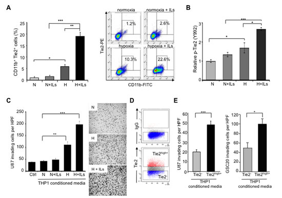 Figure 3: TEMs induce an invasive glioma cell phenotype. (A) Quantification of CD11b+Tie2+ subpopulations in THP-1 monocytic cells exposed to normoxia alone (N), hypoxia (H) alone, or co-stimulated with IL4 and IL13 (ILs). Left panel: Data are presented as mean ± SD from three independent experiments. *P < 0.05, **P < 0.01, ***P < 0.001. Right panel: Representative dot plot illustrating the percentage of Tie2+CD11b+ cells after the indicated culture treatments. (B) Determination of Tie2 phosphorylation levels in THP-1 monocytic cells exposed to normoxia alone, hypoxia alone, or co-stimulated with ILs. Data represent relative fluorescence determined by normalizing phospho-Tie2 fluorescence unit levels to the total Tie2 fluorescence unit levels. *P < 0.05, ***P < 0.001. (C) Invasion assay highlighted the role of TEMs in the invasive phenotype of gliomas. Conditioned medium was collected from THP-1 cells subjected to normoxia or hypoxia in the presence or absence of ILs and placed in the bottom well of a modified Boyden chamber. U-87 MG cells were plated in the top Matrigel-coated transwells. Left panel: Data are presented as mean ± SD of invading U-87 MG cells per HPF (200x). **P < 0.01, ***P < 0.001. Right panel: Representative images of crystal violet–stained U-87 MG cells that invaded the Matrigel layer (magnification, 50x). (D) Representative dot plot analysis for the identification of Tie2+ and Tie2- cell populations from THP-1 monocytic cells that were exposed to hypoxia and ILs. Selected populations were sorted and conditioned medium was collected. (E) U-87 MG and GSC20 invasion properties were measured using a modified Boyden chamber assay as explained in (C), where conditioned media were obtained from sorted Tie2+ and Tie2- THP-1 cultures. Data are presented as mean ± SD number of invading glioma cells per microscopic field (200x) from three independent experiments. *** P < 0.001, * P < 0.05.