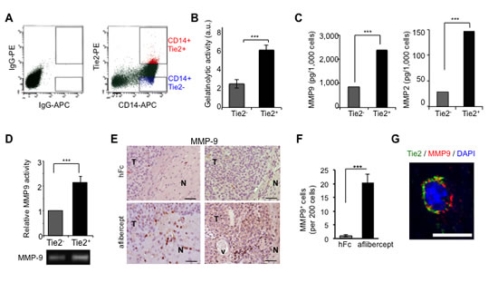Figure 4: TEMs are a major source of gelatinase activity and MMP9 secretion. (A) Enriched monocyte population isolated from PBMCs of healthy donors was doubly stained for CD14 and Tie2 and sorted as Tie2+ (CD14+Tie2+) cells or Tie2- (CD14+Tie2-) cells using FACS. Shown is a representative dot plot analysis. (B) Quantification of gelatinolytic activity present in conditioned medium of sorted CD14+ Tie2+ and CD14+ Tie2- cells obtained from the enriched monocytic population present in PBMCs. Data are represented as mean ± SD from three independent experiments. *** P < 0.001. (C) Quantification of MMP9 and MMP2 levels present in conditioned medium of sorted CD14+Tie2+ and CD14+Tie2- cells obtained from the enriched monocytic population present in PBMCs. Data are presented as mean ± SD from three independent experiments. *** P < 0.001. (D) Conditioned medium from Tie2+ and Tie2- monocytic subsets analyzed by zymography revealed higher MMP9 activity in conditioned medium from Tie2+ monocytic cultures than in Tie2- monocytic cultures sorted from THP1 cultures. Data represent mean ± SD from three independent experiments. *** P < 0.001. (E) MMP9 detection in sections of brains from U-87 MG xenograft-bearing mice treated with aflibercept (6-week schedule). Note the presence of MMP9 immunoreactivity in infiltrative areas of tumors from mice treated with the anti-VEGF agent. N, normal tissue; T, tumor; v, vessel. Scale bar = 50 µm. (F) Quantification of MMP9 positive cells in sections of brains from U-87 MG xenograft-bearing mice treated with aflibercept (6-week schedule). Data are represented as mean ± SD of MMP9+ cells per 200 cells. (G) Confocal z-stack image of Tie2 (green) and MMP9 (red) double immunofluorescence in sections from U-87 MG xenografts treated with aflibercept (6 weeks). DAPI was used for nuclear staining (blue). Scale bar = 10 µm.