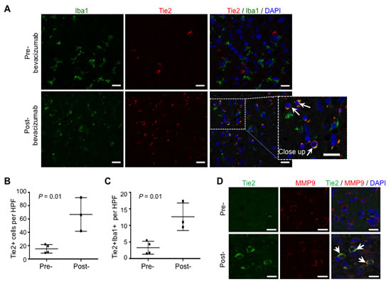 Figure 5: TEMs can be detected in human surgical glioblastoma specimens after bevacizumab therapy. (A) Glioblastoma specimens after treatment with standard chemotherapy (pre-) or with bevacizumab (post-) were analyzed for Iba1 (green) and Tie2 (red) expression. DAPI was used for nuclear staining (blue). Scale bars = 20 µm. Note the over-representation of TEMs (Tie2+Iba1+ cells) in the post-bevacizumab tumor. White arrows indicate the presence of Tie2+Iba1+ cells. Scale bars = 20 µm. (B) Quantification of Tie2+ cells in surgical human glioblastoma recurring after standard therapy (Pre-; n = 4) or after bevacizumab (Post-; n = 3). Data are represented as mean ± SD of Tie2+ cells present in a HPF. (C) Quantification of Tie2+Iba1+ double positive cells in surgical human glioblastoma recurring after standard therapy (Pre-; n = 4) or after bevacizumab (Post-; n = 3). Data are represented as mean ± SD of Tie2+ cells present in a HPF. (D) Tie2+ cells overexpressed MMP9, as indicated with the double immunofluorescence for Tie2 (green) and MMP9 (red) expression. DAPI was used for nuclear staining (blue). White arrows indicate the presence of Tie2+MMP9+ cells. Scale bar = 20 µm.