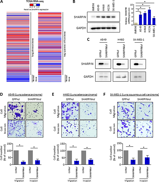 Figure 1: SHARPIN is a novel regulator of cell mobility in lung cancer cells. (A) Heat map depicting gene expression of SHARPIN from RNA-Sequencing data with lung adenocarcinoma (LUAD, normal tissues vs tumor tissues) or squamous cell carcinoma (LUSC, normal tissues vs tumor tissues) in The Cancer Genome Atlas (TCGA). Expressions of SHARPIN are ranked by sample types. RNA-Seq values are shown by indicated bar. (B) SHARPIN expression profile in lung normal fibroblast cells and lung cancer cell lines. (Left panel) Whole cell lysate immunoblots for SHARPIN and GAPDH (loading control). (Right panel) qRT-PCR for relative mRNA levels of SHARPIN. β-Actin was used as an internal control. Values are means ± S.E.M. of three independent experiments. *p < 0.05 from one-way ANOVA test. (C) Confirmation of depletion of SHARPIN in lung cancer A549, H460 and SK-MES-1 cell lines. Immunoblots for SHARPIN and GAPDH as control, from indicated cells infected with shRNA targeted against negative control (NC) or against SHARPIN. (D–F) Cell migration and invasion assays for lung cancer cell line (D) A549, (E) H460 and (F) SK-MES-1 with depletion of GFP (ctr) or SHARPIN. Representative crystal violet staining of invaded cells (upper panel) through a phase-contrast microscope (20X) is shown. Quantification of the invaded cells is shown (down panel). Values are mean ± S.E.M. of three independent experiments. *p < 0.05 from one-way ANOVA test.